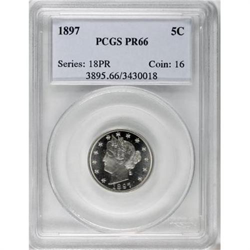 <B>1897 5C PR66 PCGS.</B></I> A meticulously struck and virtually untoned Premium Gem. Infrequent obverse flecks are all that deny an even higher assessment. Population: 58 in 66, 20 finer (2/08).<BR><BR><B>Coin Engraver:</B> Charles E. Barber<BR><BR><b>Shipping:</b> Coins & Currency (<a target="_blank" href="http://www.heritageauctions.com/common/shipping.php">view shipping information</a>)