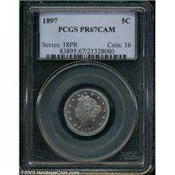<table><tr><td><TABLE cellSpacing=0 cellPadding=0 width="100%" bgColor=#000000 border=0><TBODY> <TR><TD width="100%"><TABLE cellSpacing=1 cellPadding=3 width="100%" border=0><TBODY><TR><TD width="100%" bgColor=#79735c><FONT face=arial color=#ffffff size=3><B>Description</B> </FONT></TD></TR><TR><TD width="100%" bgColor=#ffffff><FONT face=arial size=2><B>1897 5C PR67 Cameo PCGS.</B></I> Mostly brilliant with hints of blue and gold patina collecting at the border areas. The surfaces are nicely mirrored and sharply defined and a mild cameo effect is presented throughout. </FONT></TD></TR></TBODY></TABLE></TD></TR></TBODY></TABLE><BR><A name=PricesRealized></A><TABLE cellSpacing=0 cellPadding=0 width="100%" bgColor=#000000 border=0><TBODY><TR><TD width="100%"><TABLE cellSpacing=1 cellPadding=3 width="100%" border=0><TBODY><TR><TD width="100%" bgColor=#79735c><A name=PR><FONT face=arial color=#ffffff size=3><B>Previous Prices from Heritage Auctions</B> </FONT></A></TD></TR><TR><TD bgColor=#f6f6ed><TABLE cellSpacing=0 cellPadding=0 width="100%" border=1><TBODY><TR><TD align=middle width="33%"><B>Date</B></TD><TD align=middle width="33%"><B>Service</B></TD><TD align=middle width="33%"><B>Price</B></TD></TR><TR bgColor=whitesmoke><TD width="33%"><B>01/11/2003</B></TD><TD width="33%">PCGS</TD><TD width="33%">$4,887.50</TD></TR></TBODY></TABLE></TD></TR><TR><TD bgColor=#ffffff><FONT face=arial size=1 ?>PLEASE NOTE: All prices realized reflect the final hammer price PLUS the buyer's premium in auctions that charge a buyer's premium. Each item has a notation at the top of the listing indicating whether that lot included a buyer's premium. Example: A item that sells with a final hammer price of $100 and a 20% buyer's premium will display with a price realized of $120. All information listed is intended to be as accurate as possible, but errors are possible. Please use this guide carefully and inform us of any inaccuracies. </FONT></TD></TR></TBODY></TABLE></TD></TR></TBODY></TABLE><BR><TABLE cellSpacing=0 cellPadding=0 width="100%" bgColor=#000000 border=0><TBODY><TR><TD width="100%"><TABLE cellSpacing=1 cellPadding=3 width="100%" border=0><TBODY><TR><TD width="100%" bgColor=#79735c colSpan=6><FONT face=arial color=#ffffff size=3><B>Price Guide*</B> </FONT></TD></TR><TR bgColor=#f6f6ed><TD align=middle><B>Grade</B> </TD><TD align=middle><B>Coin World<BR>(Trends)</B> </TD><TD align=middle><B>Numismedia<BR>Retail</B> </TD><TD align=middle><B>Numismedia<BR>Wholesale</B> </TD><TD align=middle><B>Coin<BR>Universe</B> </TD><TD align=middle><B>Heritage<BR>Value Index</B> </TD></TR><TR bgColor=#ffffff><TD align=middle>66</TD><TD align=right>---</TD><TD align=right>---</TD><TD align=right>---</TD><TD align=right>---</TD><TD align=right>---</TD></TR><TR style="FONT-WEIGHT: bold" bgColor=#cccfdd><TD align=middle>67</TD><TD align=right>---</TD><TD align=right>---</TD><TD align=right>---</TD><TD align=right>---</TD><TD align=right>---</TD></TR><TR bgColor=#ffffff><TD align=middle>68</TD><TD align=right>---</TD><TD align=right>---</TD><TD align=right>---</TD><TD align=right>---</TD><TD align=right>---</TD></TR><TR bgColor=#ffffff><TD colSpan=6><FONT size=1>*All information listed is intended to be as accurate as possible, but errors are possible. No item may be returned or refused based on this information which is provided as a service to our customers. You should contact each pricing source directly to determine the accuracy of this information. </FONT></TD></TR></TBODY></TABLE></TD></TR></TBODY></TABLE><BR><TABLE cellSpacing=0 cellPadding=0 width="100%" bgColor=#000000 border=0><TBODY><TR><TD width="100%"><TABLE cellSpacing=1 cellPadding=3 width="100%" border=0><TBODY><TR><TD width="100%" bgColor=#79735c><FONT face=arial color=#ffffff size=3><B>Population Guide</B> </FONT></TD></TR><TR bgColor=#ffffff><TD align=middle><!-- Begin Output of Population Grid--><TABLE cellSpacing=0 cellPadding=0 width="100%" border=0><TBODY><TR><TD vAlign=center><TABLE cellSpacing=0 width="100%" border=1 cellsadding="3"><TBODY><TR><TD vAlign=center><TABLE cellSpacing=0 cellPadding=3 width="100%" border=1><TBODY><TR><TD vAlign=center align=middle bgColor=#f0f1e8 colSpan=2 <CENTER><FONT face=Arial size=2><B>PCGS Pop </B></FONT><CENTER></CENTER></TD><TD vAlign=center align=middle bgColor=#f0f1e8 colSpan=2><CENTER><FONT face=Arial size=2><B>NGC Pop</B></CENTER></FONT></TD></TR><TR><TD vAlign=center><FONT face=Arial size=2>(67)</FONT> </TD><TD vAlign=center align=right><FONT face=Arial size=2>5</FONT> </TD><TD vAlign=center><FONT face=Arial size=2>(67)</FONT> </TD><TD vAlign=center align=right><FONT face=Arial size=2>2</FONT> </TD></TR><TR><TD vAlign=center><FONT face=Arial size=2>(>67)</FONT> </TD><TD vAlign=center align=right><FONT face=Arial size=2>0</FONT> </TD><TD vAlign=center><FONT face=Arial size=2>(>67)</FONT> </TD><TD vAlign=center align=right><FONT face=Arial size=2>1</FONT> </TD></TR></TBODY></TABLE></TD></TR></TBODY></TABLE></TD></TR></TBODY></TABLE><!-- End Output of Population Grid--></TD></TR></TBODY></TABLE></TD></TR></TBODY></TABLE><BR><TABLE cellSpacing=0 cellPadding=0 width="100%" bgColor=#000000 border=0><TBODY><TR> Important notice: Heritage usually auctions material at the rate of 200-250 lots per hour. On some occasions eBay Live bid software or the Internet may not be able to keep up with the pace of the auction. We recommend placing a realistic absentee bid now as insurance to avoid disappointment. Occasionally the auctioneer may eliminate or reject an eBay Live bid, and the auctioneer may also reopen a lot after the close of the eBay live bidding (usually because we missed an audience bid), and may reject your bid even if it shows you as the winning bidder. By bidding via eBay Live, you agree that Heritage may award the lot to another bidder at its sole discretion under the circumstances described above or any other reasonable circumstances. Also please note that all Heritage lots purchased through eBay Live ca