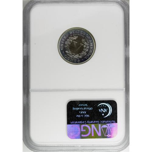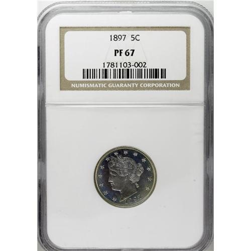 <B>1897 5C PR67 NGC.</B></I> Lemon-yellow at the obverse rim with pastel blue in the center. On the moderately reflective reverse, the blue is on the outside, and a small core of olive-green rests within the wreath. Census: 23 in 67, 2 finer (11/06).<BR><I>From The Hill Country Collection.</B></I><BR><BR><b>Shipping:</b> Coin/Currency (<a target="_blank" href="http://www.heritageauctions.com/common/shipping.php">view shipping information</a>)