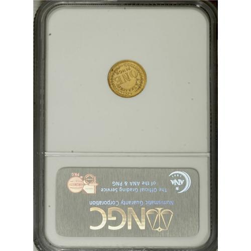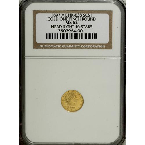 <B>1897 Alaska Gold One Pinch MS62 NGC.</B></I> AK HK-838, "Very rare." Indian head right with 16 stars around. A lovely pale gold example with only a couple of minor obverse planchet imperfections<BR><BR><b>Shipping:</b> Coin/Currency (<a target="_blank" href="http://www.heritageauctions.com/common/shipping.php">view shipping information</a>)