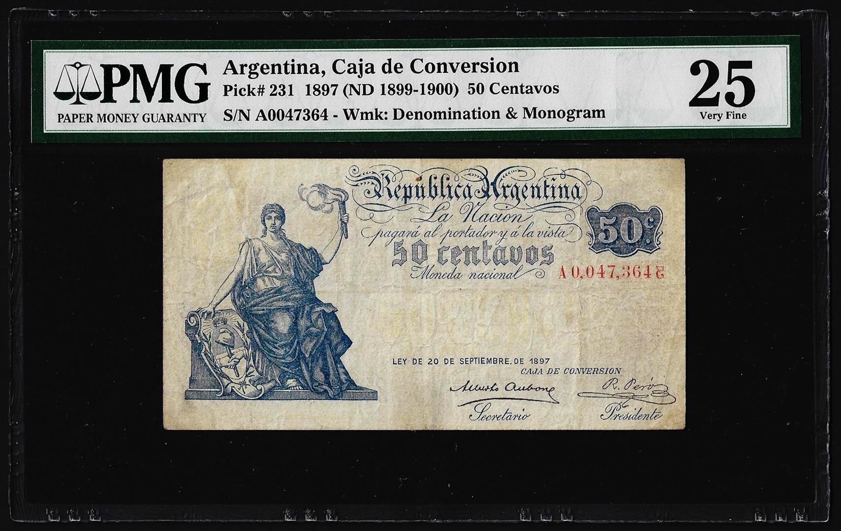 One 1897 Argentina 50 Centavos Caja de Conversion Pick# 231 PMG Very Fine 25. PMG Certified.