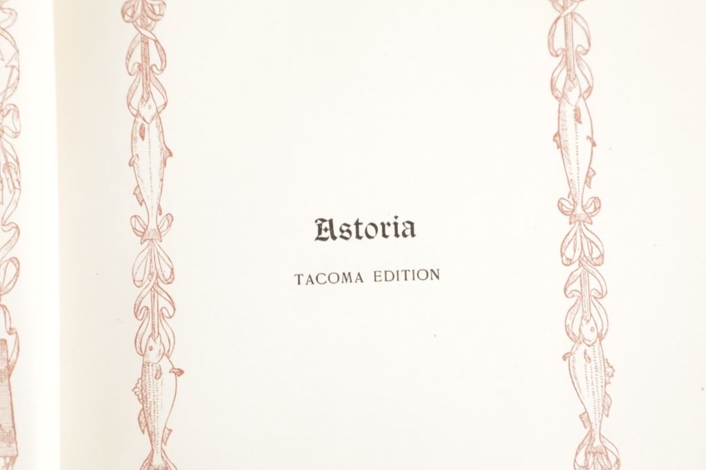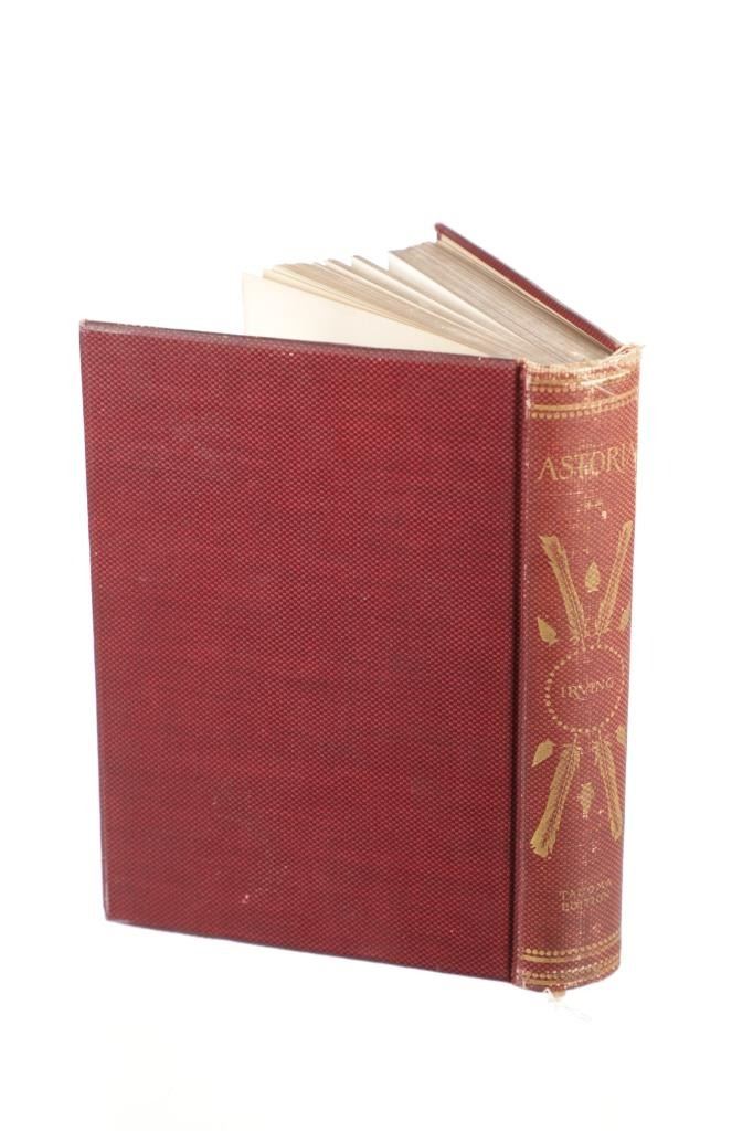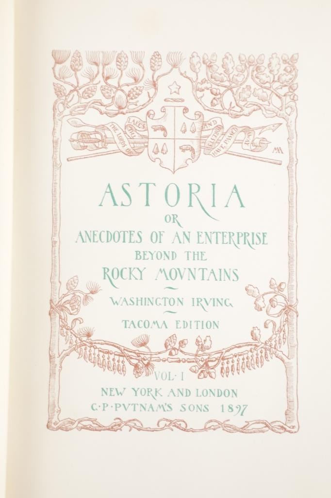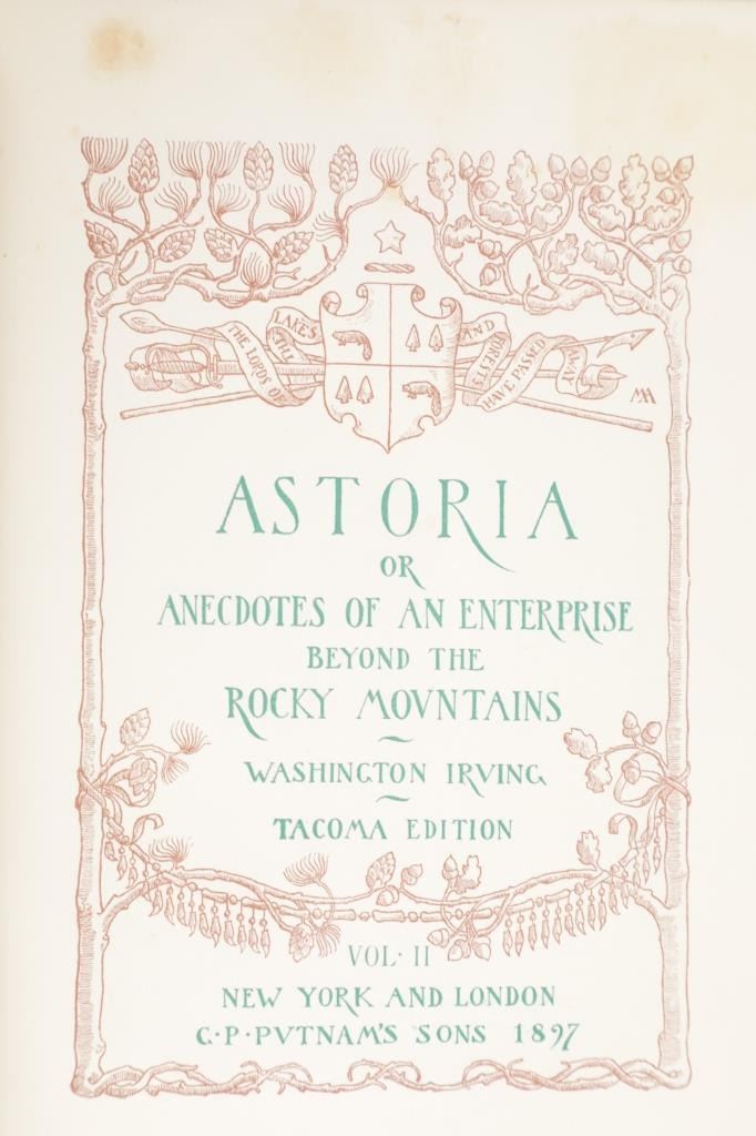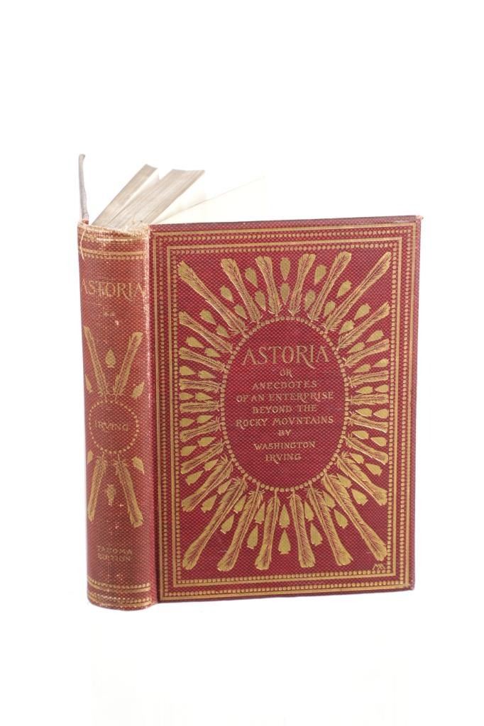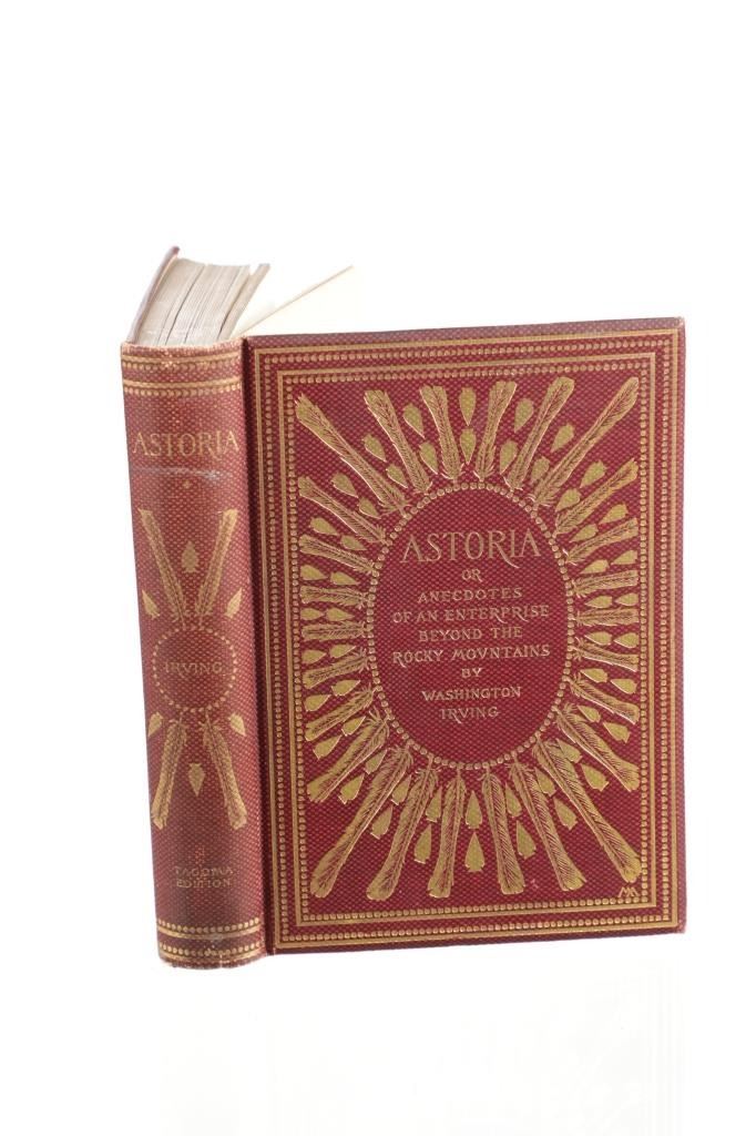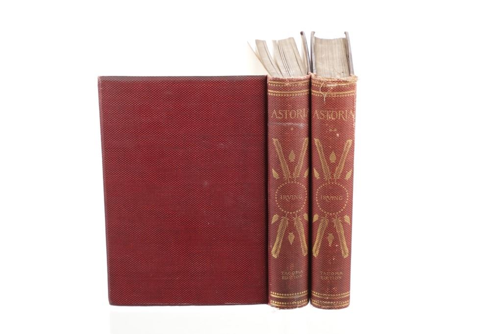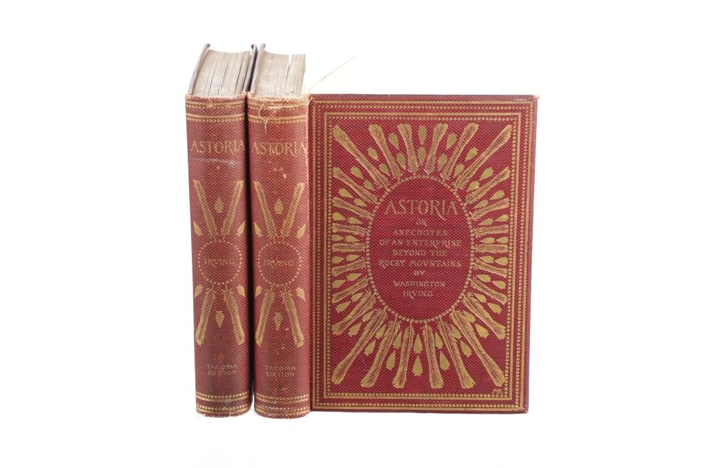 Featured in this lot is this 1897 Tacoma Edition, Astoria or Anecdotes of an Enterprise Beyond the Rocky Mountains by Washington Irving. Astoria, or Anecdotes of an Enterprise Beyond the Rocky Mountains by Washington Irving is a historical account of John Jacob Astor’s ambitious attempt to establish a fur trading empire in the Pacific Northwest during the early 19th century. The 1897 edition is one of many later reprints of this work, and while it may include revisions, updates, or new illustrations, it is not the original first edition. Collectors and historians consider the 1836 publication to be the first edition of Astoria. The condition of this pair of books is well preserved with some wear to the cover of the book in the corners and to the outside spine of the books with some slight browning of the pages consistent with the age of the book but otherwise is well preserved. The measurements of this book is 9" x 6 1/2" x 1 3/8". The collective weight of these books is 5lb.
