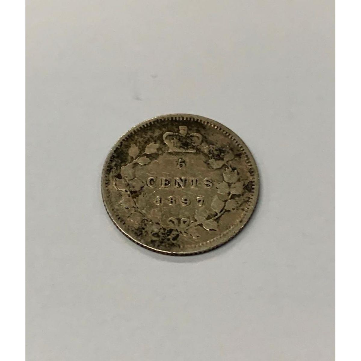 Obverse The portrait in left profile of Victoria is surrounded with the inscriptions "CANADA" and "VICTORIA DEI GRATIA REGINA" (Victoria, Queen by the grace of God) Lettering: VICTORIA DEI GRATIA REGINA. CANADA Reverse The facial value is surrounded with two maple boughs and the crown of Queen Victoria Lettering: 5 CENTS 1858 Features TypeStandard circulation coin Years1858-1901 Value5 Cents (0.05 CAD) MetalSilver (.925) Weight1.167 g Diameter15.494 mm Thickness0.70 mm ShapeRound OrientationCoin alignment ↑↓
