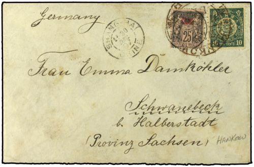 1897 Combination cover to Germany franked by 1897 China ICP 10 c. deep green tied by Hankow dollar chop in brown, thence through French PO at Shanghai with Chine 25 c. (Dec 30). A fine and scarce cover. Scott 91.