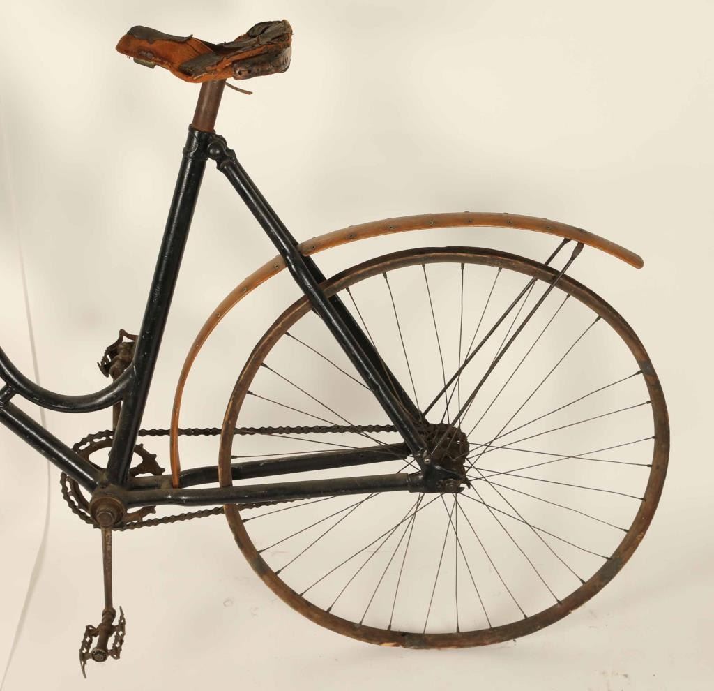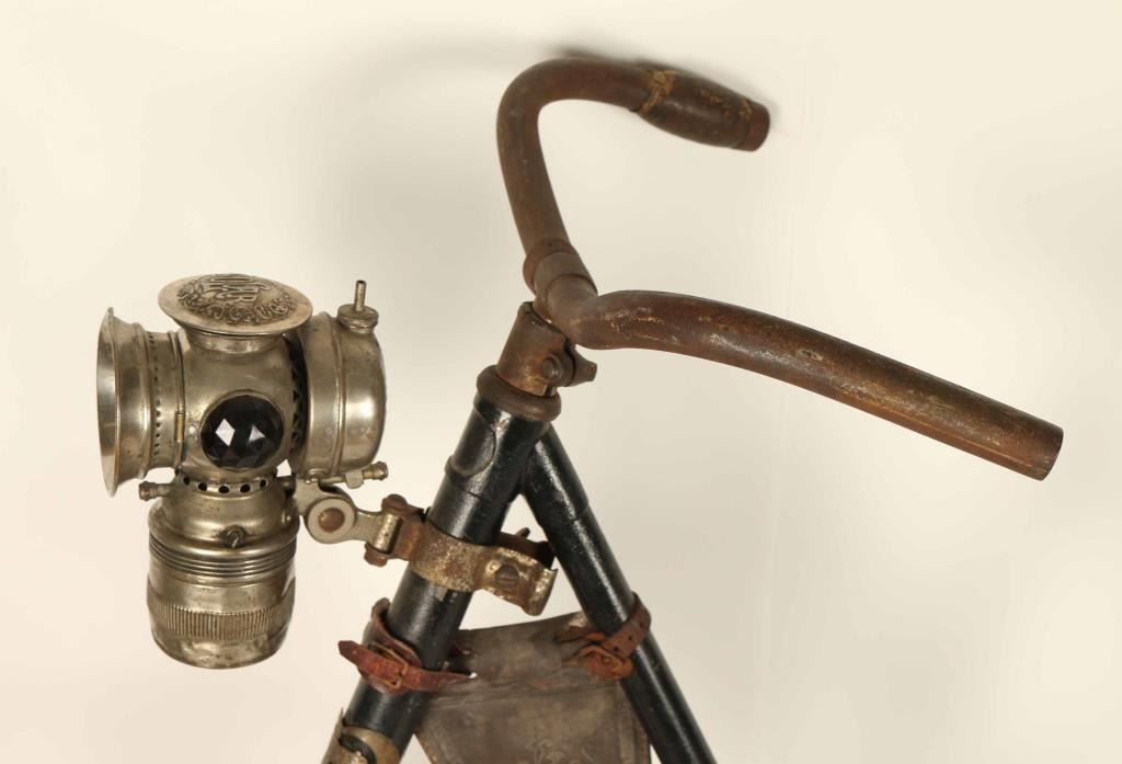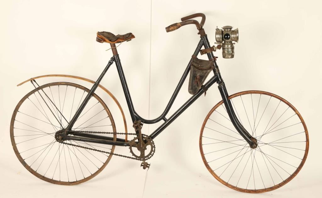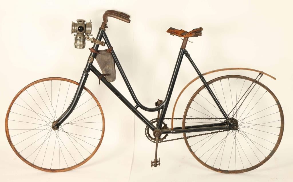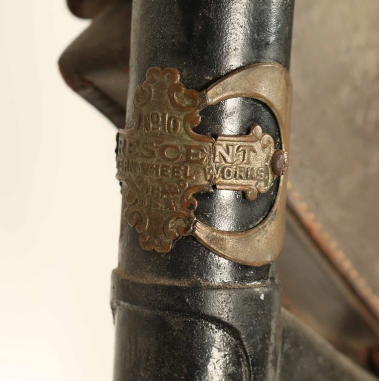 Model 10 made in Chicago, IL. With wood wheel rims and a rear wood fender. Part of front Metal 'Crescent No. 10' stamp is missing and has broken into two pieces. Seat is coming apart due to age and one of the leather handgrips is still partially intact on the metal handlebars. Very nice collectors bike. Fender has been repaired. Comes with a 'Solar' kerosene light by 'Badger Brass Mfg Co. Kenosha Wisc.' and a brown leather holster.
