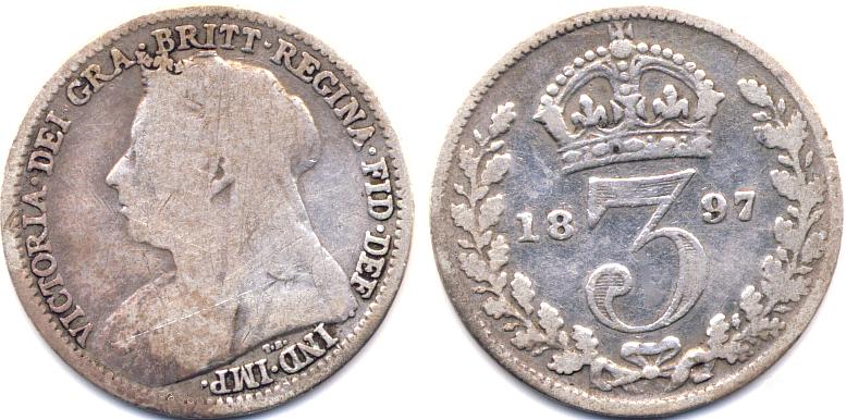 1897 GREAT BRITIAN SILVER 3 PENCE-CIRC