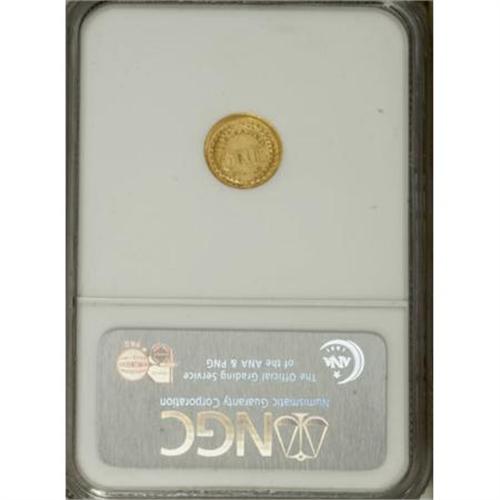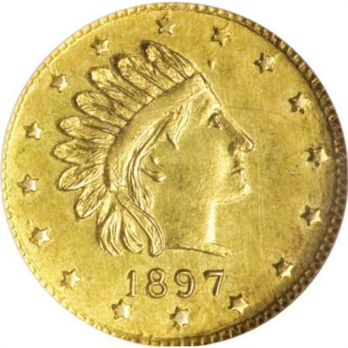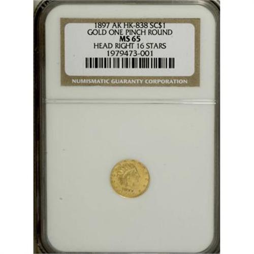 <B>1897 Gold One Pinch Round Head Right 16 Stars, HK-838, MS65 NGC.<BR></B></I><BR> Listed as "Very rare" according to the Hibler-Kappen standard reference. Lustrous gold surfaces exhibit tints of mint-green and are carefully preserved on this Gem. There are no significant handling marks to report. Some as-made die polish lines are visible under magnification.<BR><BR><b>Shipping:</b> Coins & Currency (<a target="_blank" href="http://www.heritageauctions.com/common/shipping.php">view shipping information</a>)