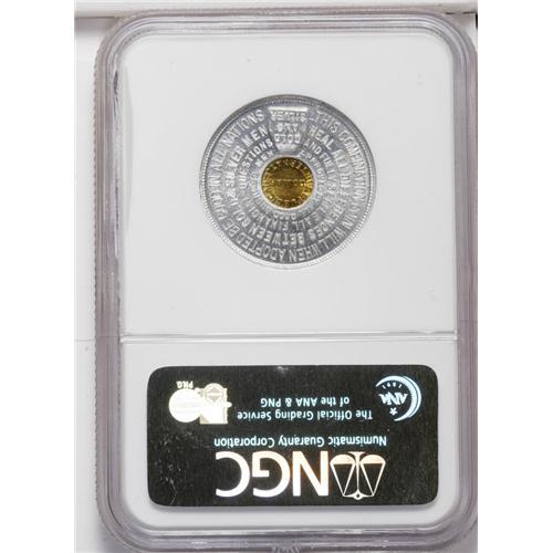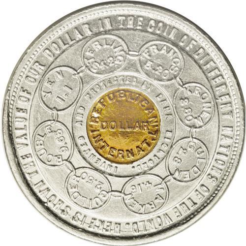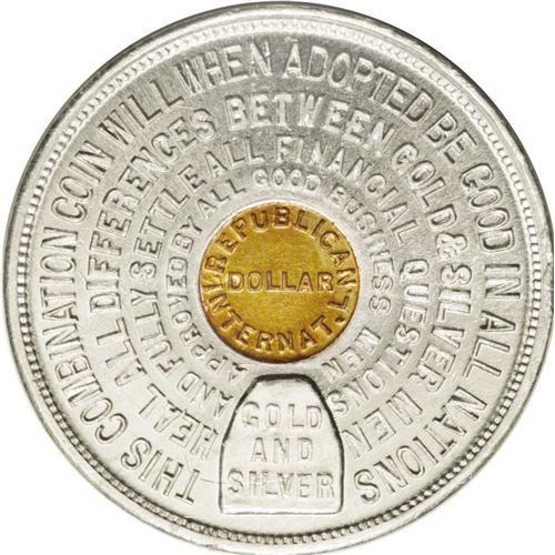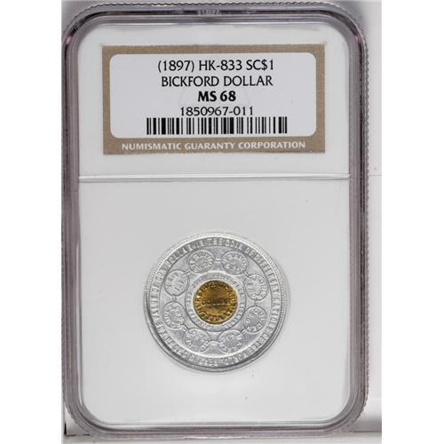 <B>(1897) Bickford Dollar Pattern, HK-833, MS68 NGC.</B></I> These were issued in 1897 by Dana Bickford, of New York, who issued eight "dollars" or patterns for an international coinage. The reverse inscription on each gives the exchange value of the dollar in several world currencies. These may also be one of the earliest uses of the bimetallic concept. This particular piece has be hands-down the finest Bickford piece we have ever seen--a Superb Gem and worthy of attention by collectors of so-called dollars. Listed as "very rare" unholed in the standard 1963 reference catalog, <I>So-Called Dollars</B></I> by Hibler and Kappen.
