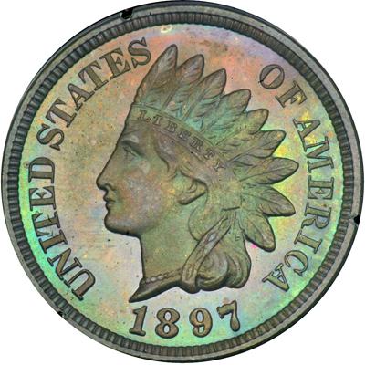 1897 Indian Head Cent. PCGS graded Proof 66 Brown. Lovely lilac and green toning. Only 1,938 pieces struck. Housed in a First Generation Holder. Outstanding quality! Pop 10; 1 finer in 67BN (PCGS # 2378).