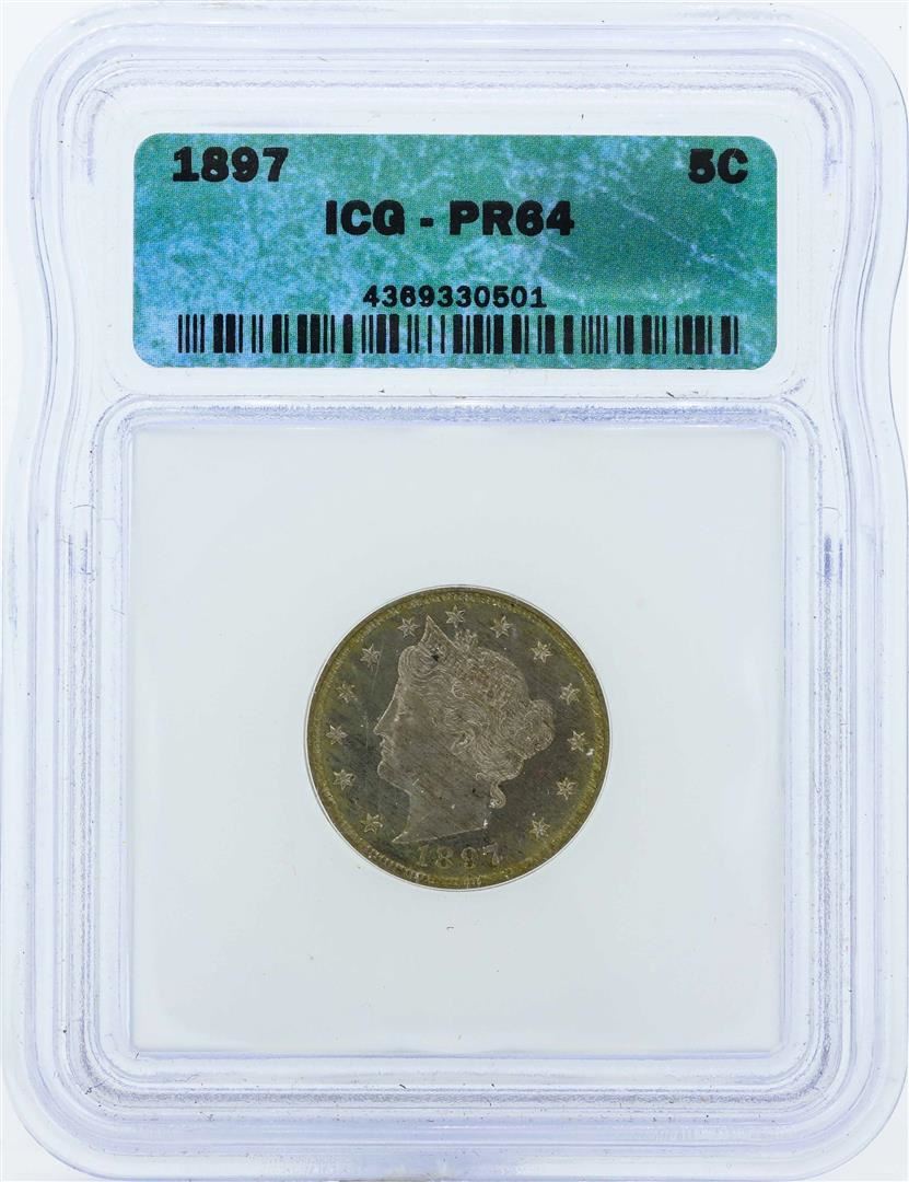One 1897 Liberty V Proof Nickel Coin ICG PR64. ICG Appraised.