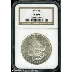 <B>1897<img border='0' src='http://www.heritagecoins.com/images/star.gif' width=10 height=10>$1 MS66 NGC.</B></I> Virtually untoned, weigh lustrous surfaces that are devoid of mentionable marks. Lot:10504