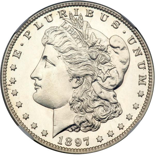 1897 Morgan Dollar. NGC graded Proof 67. Fully white gem. Only 731 pieces minted. One of the most beautiful Proofs known of this popular, late date Morgan. Few others have been graded this superb. This is a remarkably preserved specimen that has shimmering, finely reflective fields on either side. Set against the illimitable mirror of the fields are the gently frosted devices, which gives this coin its beauty and appealing appearance. Most would consider this a fresh-off-the-dies brilliant coin, meaning that it is worthy of a strong price. Pop 14; 4 finer in 68 (PCGS # 7332) .