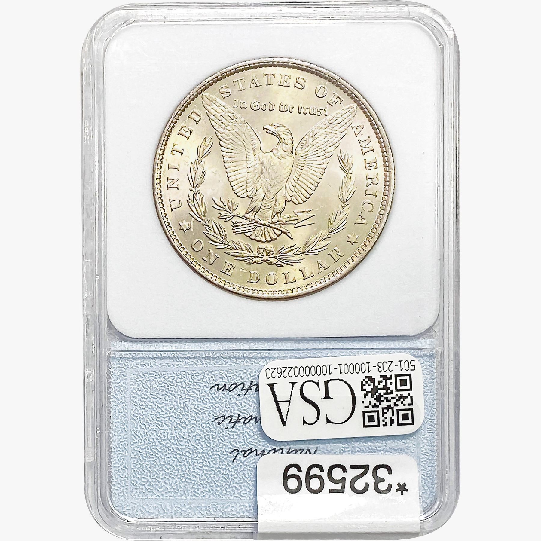 l. All non-certified coins and currency are guaranteed genuine, but are not guaranteed as to grade, since grading is a matter of opinion, an art and not a science, and therefore the description rendered by GSA or any third-party grading service may not agree with the opinion of others (including trained experts), and the same expert may not grade the same item with the same grade at two different times. GSA may, but is not obligated to, express an opinion as to non-certified numismatic items, in GSA’s opinion, or by its employees’ experience and the current interpretation of the American Numismatic Association’s standards as of the date the catalog was prepared. There is no guarantee or warranty expressed or implied that the grading opinions utilized by GSA, if any, will meet the standards of any grading service at any time in the future.