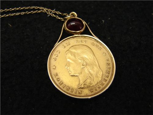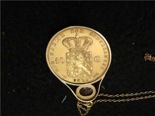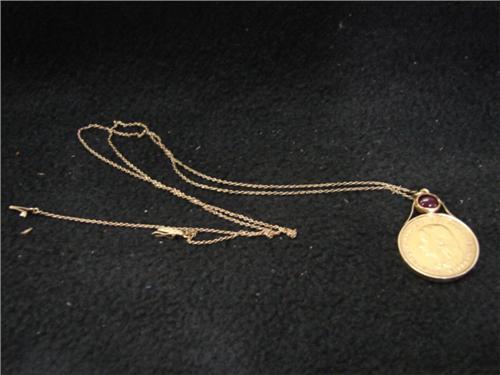 1897 NETHERLANDS KONING 10 GILDERS GOLD COIN PENDANT. Has one cabochon cut ruby and a 14KT yellow gold 18” cable chain.