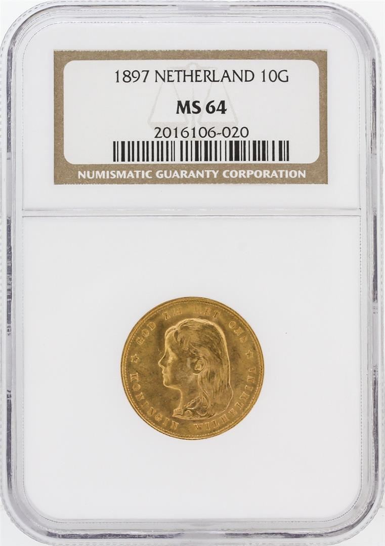 One 1897 NGC MS64 Netherland 10G Gold Coin. NGC Certified.