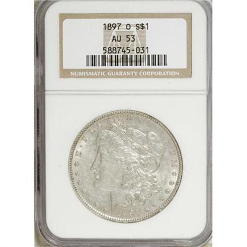 <B>1897-O $1 AU53 NGC.</B></I> . NGC Census: (379/3142). PCGS Population (229/2588). Mintage: 4,004,000. Numismedia Wsl. Price for NGC/PCGS coin in AU53: $115. (#7248)<BR><BR><B>Coin Engraver:</B> George T. Morgan<BR><BR><b>Shipping:</b> Coins & Currency (<a target="_blank" href="http://www.heritageauctions.com/common/shipping.php">view shipping information</a>)