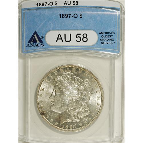 <B>1897-O $1 AU58 ANACS.</B></I> NGC Census: (1102/1281). PCGS Population (780/1037). Mintage: 4,004,000. Numismedia Wsl. Price: $200. (#7248)<BR><BR><b>Shipping:</b> Coins & Currency (<a target="_blank" href="http://www.heritageauctions.com/common/shipping.php">view shipping information</a>)