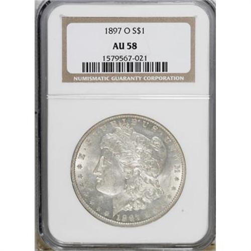 <B>1897-O $1 AU58 NGC.</B></I> . NGC Census: (1198/1362). PCGS Population (824/1177). Mintage: 4,004,000. Numismedia Wsl. Price for NGC/PCGS coin in AU58: $300. (#7248)<BR><BR><B>Coin Engraver:</B> George T. Morgan<BR><BR><b>Shipping:</b> Coins & Currency (<a target="_blank" href="http://www.heritageauctions.com/common/shipping.php">view shipping information</a>)