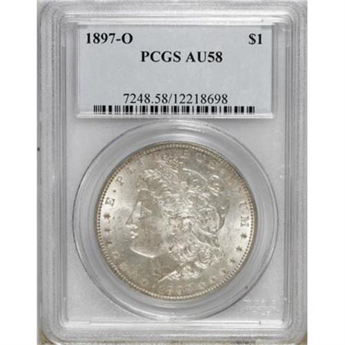 <B>1897-O $1 AU58 PCGS.</B></I> . PCGS Population (824/1177). NGC Census: (1198/1362). Mintage: 4,004,000. Numismedia Wsl. Price for NGC/PCGS coin in AU58: $300. (#7248)<BR><BR><B>Coin Engraver:</B> George T. Morgan<BR><BR><b>Shipping:</b> Coins & Currency (<a target="_blank" href="http://www.heritageauctions.com/common/shipping.php">view shipping information</a>)