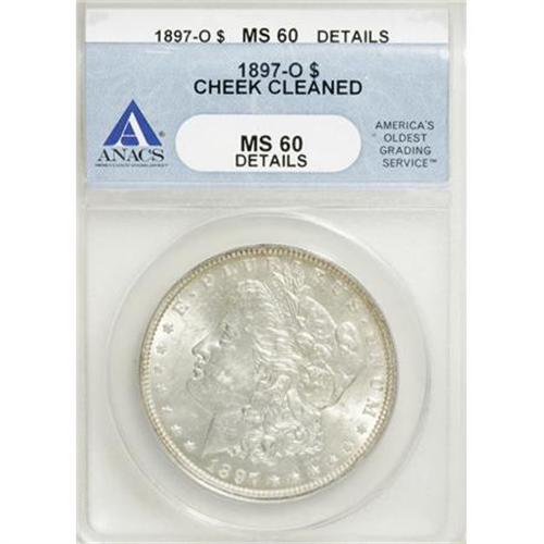 <B>1897-O $1 --Cheek Cleaned--ANACS.</B></I> <B>MS60 Details.</B></I> NGC Census: (199/1147). PCGS Population (116/1033). Mintage: 4,004,000. Numismedia Wsl. Price for NGC/PCGS coin in MS60: $590. (#7248)<BR><BR><B>Coin Engraver:</B> George T. Morgan<BR><BR><b>Shipping:</b> Coins & Currency (<a target="_blank" href="http://www.heritageauctions.com/common/shipping.php">view shipping information</a>)