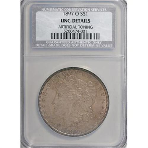 <B>1897-O $1 --Artificially Toned--NCS. Unc Details.</B></I> NGC Census: (0/0). PCGS Population (0/0). Mintage: 4,004,000. (#7248)<BR><BR><B>Coin Engraver:</B> George T. Morgan<BR><BR><b>Shipping:</b> Coins & Currency (<a target="_blank" href="http://www.heritageauctions.com/common/shipping.php">view shipping information</a>)