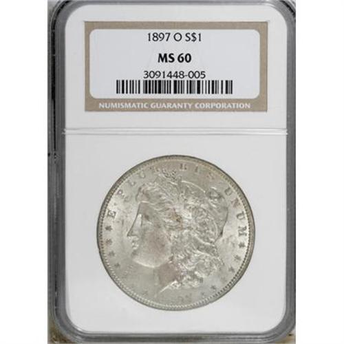<B>1897-O $1 MS60 NGC.</B></I> NGC Census: (200/1161). PCGS Population (116/1044). Mintage: 4,004,000. Numismedia Wsl. Price for NGC/PCGS coin in MS60: $590. (#7248)<BR><BR><B>Coin Engraver:</B> George T. Morgan<BR><BR><b>Shipping:</b> Coins & Currency (<a target="_blank" href="http://www.heritageauctions.com/common/shipping.php">view shipping information</a>)