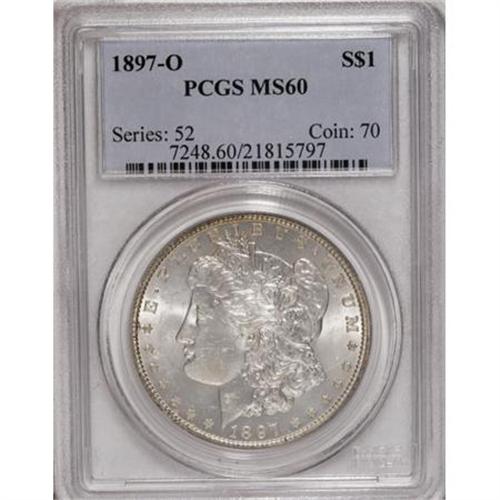 <B>1897-O $1 MS60 PCGS.</B></I> Above-average definition for the issue with powerful luster and minimal patina. Though the reverse is comparatively clean, the portrait and nearby fields show myriad fine abrasions.<BR><BR><B>Coin Engraver:</B> George T. Morgan<BR><BR><b>Shipping:</b> Coins & Currency (<a target="_blank" href="http://www.heritageauctions.com/common/shipping.php">view shipping information</a>)