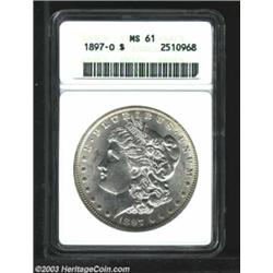 <TR><TD width="100%"><TABLE cellSpacing=1 cellPadding=3 width="100%" border=0><TBODY><TR><TD width="100%" bgColor=#79735c><FONT face=arial color=#ffffff size=3><B>Description</B> </FONT></TD></TR><TR><TD width="100%" bgColor=#ffffff><FONT face=arial size=2><B>1897-O $1 MS61 ANACS.</B></I> A satiny and brilliant representative with a typical strike. The surfaces are only lightly marked. Although more than four million pieces were struck, this issue is difficult to find in Mint State. </FONT></TD></TR></TBODY></TABLE></TD></TR></TBODY></TABLE><BR><A name=PricesRealized></A><TABLE cellSpacing=0 cellPadding=0 width="100%" bgColor=#000000 border=0><TBODY><TR><TD width="100%"><TABLE cellSpacing=1 cellPadding=3 width="100%" border=0><TBODY><TR><TD width="100%" bgColor=#79735c><A name=PR><FONT face=arial color=#ffffff size=3><B>Previous Prices from Heritage Auctions</B> </FONT></A></TD></TR><TR><TD bgColor=#f6f6ed><TABLE cellSpacing=0 cellPadding=0 width="100%" border=1><TBODY><TR><TD align=middle width="33%"><B>Date</B></TD><TD align=middle width="33%"><B>Service</B></TD><TD align=middle width="33%"><B>Price</B></TD></TR><TR bgColor=whitesmoke><TD width="33%"><B>11/23/2002</B></TD><TD width="33%">PCGS</TD><TD width="33%">$632.50</TD></TR><TR bgColor=whitesmoke><TD width="33%"><B>02/06/2001</B></TD><TD width="33%">PCGS</TD><TD width="33%">$675.00</TD></TR><TR bgColor=whitesmoke><TD width="33%"><B>06/13/2000</B></TD><TD width="33%">PCGS</TD><TD width="33%">$410.00</TD></TR><TR bgColor=whitesmoke><TD width="33%"><B>03/01/1998</B></TD><TD width="33%">PCGS</TD><TD width="33%">$1,760.00</TD></TR><TR bgColor=whitesmoke><TD width="33%"><B>10/08/2002</B></TD><TD width="33%">NGC</TD><TD width="33%">$603.75</TD></TR><TR bgColor=whitesmoke><TD width="33%"><B>03/26/2002</B></TD><TD width="33%">NGC</TD><TD width="33%">$718.75</TD></TR><TR bgColor=whitesmoke><TD width="33%"><B>02/20/2001</B></TD><TD width="33%">NGC</TD><TD width="33%">$550.00</TD></TR><TR bgColor=whitesmoke><TD width="33%"><B>01/04/1995</B></TD><TD width="33%">NGC</TD><TD width="33%">$605.00</TD></TR><TR bgColor=whitesmoke><TD width="33%"><B>05/05/2000</B></TD><TD width="33%">NGC</TD><TD width="33%">$517.50</TD></TR><TR bgColor=whitesmoke><TD width="33%"><B>09/21/1996</B></TD><TD width="33%">NGC</TD><TD width="33%">$506.00</TD></TR><TR bgColor=whitesmoke><TD width="33%"><B>01/12/2002</B></TD><TD width="33%">ANACS</TD><TD width="33%">$488.75</TD></TR><TR bgColor=whitesmoke><TD width="33%"><B>11/15/2001</B></TD><TD width="33%">ANACS</TD><TD width="33%">$563.50</TD></TR><TR bgColor=whitesmoke><TD width="33%"><B>01/05/2001</B></TD><TD width="33%">ANACS</TD><TD width="33%">$632.50</TD></TR><TR bgColor=whitesmoke><TD width="33%"><B>05/01/1999</B></TD><TD width="33%">ANACS</TD><TD width="33%">$825.00</TD></TR></TBODY></TABLE></TD></TR><TR><TD bgColor=#ffffff><FONT face=arial size=1 ?>PLEASE NOTE: All prices realized reflect the final hammer price PLUS the buyer's premium in auctions that charge a buyer's premium. Each item has a notation at the top of the listing indicating whether that lot included a buyer's premium. Example: A item that sells with a final hammer price of $100 and a 20% buyer's premium will display with a price realized of $120. All information listed is intended to be as accurate as possible, but errors are possible. Please use this guide carefully and inform us of any inaccuracies. </FONT></TD></TR></TBODY></TABLE></TD></TR></TBODY></TABLE><BR><TABLE cellSpacing=0 cellPadding=0 width="100%" bgColor=#000000 border=0><TBODY><TR><TD width="100%"><TABLE cellSpacing=1 cellPadding=3 width="100%" border=0><TBODY><TR><TD width="100%" bgColor=#79735c colSpan=6><FONT face=arial color=#ffffff size=3><B>Price Guide*</B> </FONT></TD></TR><TR bgColor=#f6f6ed><TD align=middle><B>Grade</B> </TD><TD align=middle><B>Coin World<BR>(Trends)</B> </TD><TD align=middle><B>Numismedia<BR>Retail</B> </TD><TD align=middle><B>Numismedia<BR>Wholesale</B> </TD><TD align=middle><B>Coin<BR>Universe</B> </TD><TD align=middle><B>Heritage<BR>Value Index</B> </TD></TR><TR bgColor=#ffffff><TD align=middle>60</TD><TD align=right>$625.00</TD><TD align=right>$575.00</TD><TD align=right>$479.00</TD><TD align=right>$600.00</TD><TD align=right>$419.00</TD></TR><TR style="FONT-WEIGHT: bold" bgColor=#cccfdd><TD align=middle>61</TD><TD align=right>---</TD><TD align=right>$920.00</TD><TD align=right>$765.00</TD><TD align=right>---</TD><TD align=right>$856.56</TD></TR><TR bgColor=#ffffff><TD align=middle>62</TD><TD align=right>$1,850.00</TD><TD align=right>---</TD><TD align=right>$1,225.00</TD><TD align=right>$1,300.00</TD><TD align=right>$1,340.63</TD></TR><TR bgColor=#ffffff><TD colSpan=6><FONT size=1>*All information listed is intended to be as accurate as possible, but errors are possible. No item may be returned or refused based on this information which is provided as a service to our customers. You should contact each pricing source directly to determine the accuracy of this information. </FONT></TD></TR></TBODY></TABLE></TD></TR></TBODY></TABLE><BR><TABLE cellSpacing=0 cellPadding=0 width="100%" bgColor=#000000 border=0><TBODY><TR><TD width="100%"><TABLE cellSpacing=1 cellPadding=3 width="100%" border=0><TBODY><TR><TD width="100%" bgColor=#79735c><FONT face=arial color=#ffffff size=3><B>Population Guide</B> </FONT></TD></TR><TR bgColor=#ffffff><TD align=middle><!-- Begin Output of Population Grid--><TABLE cellSpacing=0 cellPadding=0 width="100%" border=0><TBODY><TR><TD vAlign=center><TABLE cellSpacing=0 width="100%" border=1 cellsadding="3"><TBODY><TR><TD vAlign=center><TABLE cellSpacing=0 cellPadding=3 width="100%" border=1><TBODY><TR><TD vAlign=center align=middle bgColor=#f0f1e8 colSpan=2 <CENTER><FONT face=Arial size=2><B>PCGS Pop </B></FONT><CENTER></CENTER></TD><TD vAlign=center align=middle bgColor=#f0f1e8 colSpan=2><CENTER><FONT face=Arial size=2><B>NGC Pop</B></CENTER></FONT></TD></TR><TR><TD vAlign=center><FONT face=Arial size=2>(61)</FONT> </TD><TD vAlign=ce
