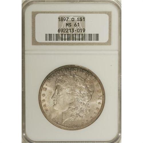 <B>1897-O $1 MS61 NGC.</B></I> NGC Census: (388/723). PCGS Population (259/617). Mintage: 4,004,000. Numismedia Wsl. Price for NGC/PCGS coin in MS61: $1,025. (#7248)<BR><BR><b>Shipping:</b> Coins & Currency (<a target="_blank" href="http://www.heritageauctions.com/common/shipping.php">view shipping information</a>)