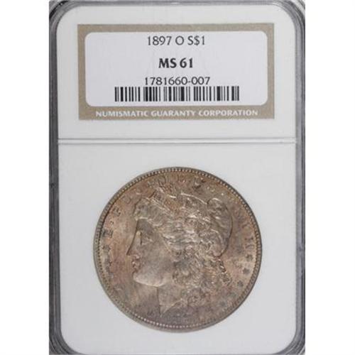 <B>1897-O $1 MS61 NGC.</B></I> <B>1897-O S$1 MS61 NGC.</B></I> Generally well struck, except for slight weakness above Liberty's ear, with unabated luster and surfaces that seem minimally abraded, for the MS61 grade level. The obverse displays pale violet-red toning, while the reverse has a pale golden-silver cast. <BR><BR><b>Shipping:</b> Coins & Currency (<a target="_blank" href="http://www.heritageauctions.com/common/shipping.php">view shipping information</a>)