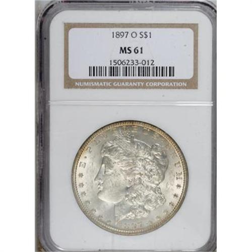 <B>1897-O $1 MS61 NGC.</B></I> Coins from this issue are usually softly struck on the central design elements, and this example is no exception. The lustrous surfaces are generally untoned, but golden rim coloration is appealing. The piece is moderately abraded, preventing a finer grade assessment. <BR><BR><B>Coin Engraver:</B> George T. Morgan<BR><BR><b>Shipping:</b> Coins & Currency (<a target="_blank" href="http://www.heritageauctions.com/common/shipping.php">view shipping information</a>)