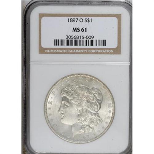 <B>1897-O $1 MS61 NGC.</B></I> A strongly lustrous example that shows atypically solid detail for this O-mint issue. Whispers of golden patina visit the margins, but the surfaces are silver-gray otherwise. A number of scattered, thin abrasions affect the fields and the portrait.<BR><BR><B>Coin Engraver:</B> George T. Morgan<BR><BR><b>Shipping:</b> Coins & Currency (<a target="_blank" href="http://www.heritageauctions.com/common/shipping.php">view shipping information</a>)