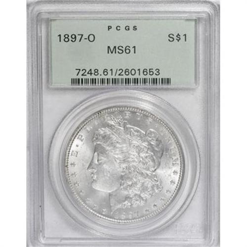 <B>1897-O $1 MS61 PCGS.</B></I> Strongly lustrous with above-average detail on the devices. The surfaces are untoned save for a few points of deep russet color at the upper reverse rim. Scattered abrasions, including a number on the portrait, account for the grade for this later O-mint Morgan dollar. In a green label holder.<BR><BR><b>Shipping:</b> Coins & Currency (<a target="_blank" href="http://www.heritageauctions.com/common/shipping.php">view shipping information</a>)