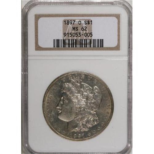 <B>1897-O $1 MS62 NGC.</B></I> Delicate golden tints visit the otherwise silver-white surfaces of this O-mint Morgan dollar. Well-defined with strong luster beneath the patina and strong eye appeal.<BR><BR><B>Coin Engraver:</B> George T. Morgan<BR><BR><b>Shipping:</b> Coins & Currency (<a target="_blank" href="http://www.heritageauctions.com/common/shipping.php">view shipping information</a>)