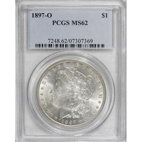 <B>1897-O $1 MS62 PCGS.</B></I> A satiny and nearly untoned better date dollar that has surprisingly smooth surfaces for the designated grade. The centers are slightly softly defined, as generally seen.<BR><BR><b>Shipping:</b> Coins & Currency (<a target="_blank" href="http://www.heritageauctions.com/common/shipping.php">view shipping information</a>)