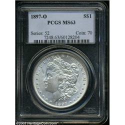 <table><tr><td><TABLE cellSpacing=0 cellPadding=0 width="100%" bgColor=#000000 border=0><TBODY> <TR><TD width="100%"><TABLE cellSpacing=1 cellPadding=3 width="100%" border=0><TBODY><TR><TD width="100%" bgColor=#79735c><FONT face=arial color=#ffffff size=3><B>Description</B> </FONT></TD></TR><TR><TD width="100%" bgColor=#ffffff><FONT face=arial size=2><B>1897-O $1 MS63 PCGS.</B></I> According to Wayne Miller's <I>The Morgan and Peace Dollar Textbook,,</B></I> "The typical 1897-O is poorly struck, with inadequate luster and worse than average bagmarks." The currently offered example, however, is sharply defined, with only slight softness observed above Liberty's ear and on the eagle's breast. The virtually untoned surfaces display radiant luster, which is nearly full and unusually good for the issue. Each side has a handful of moderate to heavy abrasions, which limit the grade, including one apiece on Liberty's cheek and behind the eagle's eye. Overall, though, this coin is a surprisingly nice representative of the 1897-O Morgan dollar, which is seldom seen in Mint State. Population: 135 in 63, 34 finer (8/03). </FONT></TD></TR></TBODY></TABLE></TD></TR></TBODY></TABLE><BR><A name=PricesRealized></A><TABLE cellSpacing=0 cellPadding=0 width="100%" bgColor=#000000 border=0><TBODY><TR><TD width="100%"><TABLE cellSpacing=1 cellPadding=3 width="100%" border=0><TBODY><TR><TD width="100%" bgColor=#79735c><A name=PR><FONT face=arial color=#ffffff size=3><B>Previous Prices from Heritage Auctions</B> </FONT></A></TD></TR><TR><TD bgColor=#f6f6ed><TABLE cellSpacing=0 cellPadding=0 width="100%" border=1><TBODY><TR><TD align=middle width="33%"><B>Date</B></TD><TD align=middle width="33%"><B>Service</B></TD><TD align=middle width="33%"><B>Price</B></TD></TR><TR bgColor=whitesmoke><TD width="33%"><B>10/22/2002</B></TD><TD width="33%">PCGS</TD><TD width="33%">$3,220.00</TD></TR><TR bgColor=whitesmoke><TD width="33%"><B>08/06/2002</B></TD><TD width="33%">PCGS</TD><TD width="33%">$3,220.00</TD></TR><TR bgColor=whitesmoke><TD width="33%"><B>07/09/2002</B></TD><TD width="33%">NGC</TD><TD width="33%">$3,105.00</TD></TR><TR bgColor=whitesmoke><TD width="33%"><B>02/12/2002</B></TD><TD width="33%">PCGS</TD><TD width="33%">$3,921.50</TD></TR><TR bgColor=whitesmoke><TD width="33%"><B>09/20/2003</B></TD><TD width="33%">PCGS</TD><TD width="33%">$2,875.00</TD></TR><TR bgColor=whitesmoke><TD width="33%"><B>05/31/2003</B></TD><TD width="33%">PCGS</TD><TD width="33%">$4,485.00</TD></TR><TR bgColor=whitesmoke><TD width="33%"><B>05/03/2003</B></TD><TD width="33%">PCGS</TD><TD width="33%">$3,910.00</TD></TR><TR bgColor=whitesmoke><TD width="33%"><B>03/01/2003</B></TD><TD width="33%">PCGS</TD><TD width="33%">$3,680.00</TD></TR><TR bgColor=whitesmoke><TD width="33%"><B>01/11/2003</B></TD><TD width="33%">ANACS</TD><TD width="33%">$2,415.00</TD></TR><TR bgColor=whitesmoke><TD width="33%"><B>01/11/2003</B></TD><TD width="33%">PCGS</TD><TD width="33%">$4,600.00</TD></TR><TR bgColor=whitesmoke><TD width="33%"><B>04/27/2002</B></TD><TD width="33%">NGC</TD><TD width="33%">$2,760.00</TD></TR><TR bgColor=whitesmoke><TD width="33%"><B>04/27/2002</B></TD><TD width="33%">NGC</TD><TD width="33%">$2,875.00</TD></TR><TR bgColor=whitesmoke><TD width="33%"><B>01/12/2002</B></TD><TD width="33%">PCGS</TD><TD width="33%">$2,875.00</TD></TR><TR bgColor=whitesmoke><TD width="33%"><B>08/05/2001</B></TD><TD width="33%">PCGS</TD><TD width="33%">$3,450.00</TD></TR><TR bgColor=whitesmoke><TD width="33%"><B>08/08/2001</B></TD><TD width="33%">NGC</TD><TD width="33%">$2,587.50</TD></TR><TR bgColor=whitesmoke><TD width="33%"><B>08/08/2001</B></TD><TD width="33%">PCGS</TD><TD width="33%">$2,990.00</TD></TR><TR bgColor=whitesmoke><TD width="33%"><B>08/07/2000</B></TD><TD width="33%">NGC</TD><TD width="33%">$5,750.00</TD></TR><TR bgColor=whitesmoke><TD width="33%"><B>11/19/1999</B></TD><TD width="33%">PCGS</TD><TD width="33%">$3,220.00</TD></TR><TR bgColor=whitesmoke><TD width="33%"><B>11/18/1999</B></TD><TD width="33%">PCGS</TD><TD width="33%">$2,875.00</TD></TR><TR bgColor=whitesmoke><TD width="33%"><B>08/13/1999</B></TD><TD width="33%">NGC</TD><TD width="33%">$2,875.00</TD></TR><TR bgColor=whitesmoke><TD width="33%"><B>08/13/1999</B></TD><TD width="33%">PCGS</TD><TD width="33%">$3,910.00</TD></TR><TR bgColor=whitesmoke><TD width="33%"><B>06/04/1999</B></TD><TD width="33%">PCGS</TD><TD width="33%">$4,140.00</TD></TR><TR bgColor=whitesmoke><TD width="33%"><B>06/04/1999</B></TD><TD width="33%">NGC</TD><TD width="33%">$4,485.00</TD></TR><TR bgColor=whitesmoke><TD width="33%"><B>04/23/1999</B></TD><TD width="33%">ANACS</TD><TD width="33%">$2,702.50</TD></TR><TR bgColor=whitesmoke><TD width="33%"><B>04/23/1999</B></TD><TD width="33%">PCGS</TD><TD width="33%">$4,715.00</TD></TR><TR bgColor=whitesmoke><TD width="33%"><B>03/13/1999</B></TD><TD width="33%">NGC</TD><TD width="33%">$2,645.00</TD></TR><TR bgColor=whitesmoke><TD width="33%"><B>09/26/1998</B></TD><TD width="33%">NGC</TD><TD width="33%">$2,990.00</TD></TR><TR bgColor=whitesmoke><TD width="33%"><B>08/07/1998</B></TD><TD width="33%">NGC</TD><TD width="33%">$2,990.00</TD></TR><TR bgColor=whitesmoke><TD width="33%"><B>01/04/1995</B></TD><TD width="33%">PCGS</TD><TD width="33%">$3,080.00</TD></TR><TR bgColor=whitesmoke><TD width="33%"><B>08/06/2001</B></TD><TD width="33%">PCGS</TD><TD width="33%">$3,450.00</TD></TR><TR bgColor=whitesmoke><TD width="33%"><B>06/01/2001</B></TD><TD width="33%">PCGS</TD><TD width="33%">$3,565.00</TD></TR><TR bgColor=whitesmoke><TD width="33%"><B>10/01/2001</B></TD><TD width="33%">PCGS</TD><TD width="33%">$3,567.00</TD></TR><TR bgColor=whitesmoke><TD width="33%"><B>05/01/2001</B></TD><TD width="33%">PCGS</TD><TD width="33%">$2,875.00</TD></TR><TR bgColor=whitesmoke><TD width="33%"><B>02/01/2001</B></TD><TD width="33%">PCGS</TD><TD width="33%">$2,875.00</TD></TR><TR bgColor=whitesmoke><TD width="33%"><B>02/18/2002</B></TD><TD width="33%">PCGS</TD><TD width="33%">$3,105.00</TD></TR><T