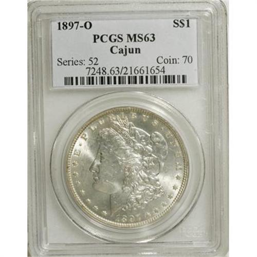 <B>1897-O $1 MS63 PCGS.</B></I> <B>1897-O S$1 MS63 PCGS.</B></I> Ex: Cajun Collection. An excellent strike, considering it is a late New Orleans Mint dollar. There is good detail to the breast feathers, and a reasonable amount of the detail above the ear is also present. The fields are silver-white, and show abundant cartwheel luster for this often lackluster issue.<BR><BR><b>Shipping:</b> Coins & Currency (<a target="_blank" href="http://www.heritageauctions.com/common/shipping.php">view shipping information</a>)