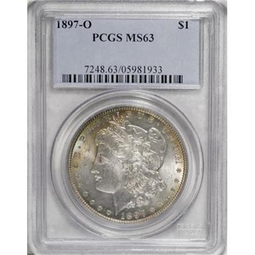 <B>1897-O $1 MS63 PCGS.</B></I> Well struck with shimmering mint luster and nicely preserved surfaces that show a few wispy marks and shallow luster grazes on Liberty's face, and in the upper left obverse field. Light gold, terra cotta, and sea-green toning adorns the obverse periphery, while speckled terra cotta occurs over much of the reverse.<BR><BR><B>Coin Engraver:</B> George T. Morgan<BR><BR><b>Shipping:</b> Coins & Currency (<a target="_blank" href="http://www.heritageauctions.com/common/shipping.php">view shipping information</a>\)