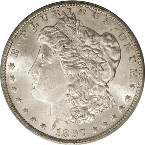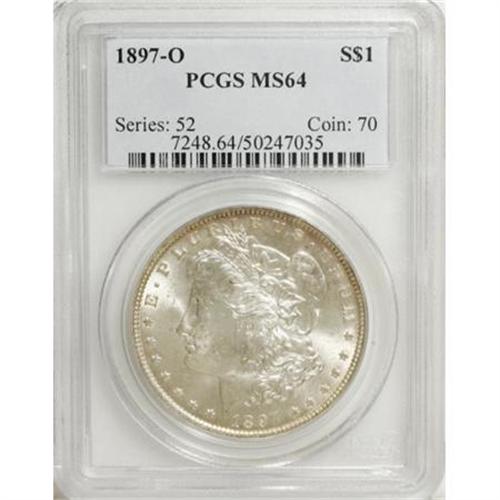 <B>1897-O $1 MS64 PCGS.</B></I> The 1897-O is one of those Morgan dollar issues that gets no respect. Many are found with insipid luster, weak strikes, or a combination of those, and Gem examples are nearly unheard of. The present near-Gem features radiant cartwheel luster, superb surface appearance, good coloration in the form of a light silver-gold cast with slight tinges of lilac, and a good if not full strike. Only light abrasions prevent the Gem grade, but the eye appeal is extremely high. PCGS has certified only 29 examples in MS64, with only 13 pieces even finer (7/07). <BR><BR><B>Coin Engraver:</B> George T. Morgan<BR><BR><b>Shipping:</b> Coins & Currency (<a target="_blank" href="http://www.heritageauctions.com/common/shipping.php">view shipping information</a>\)