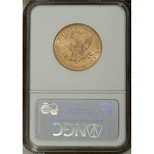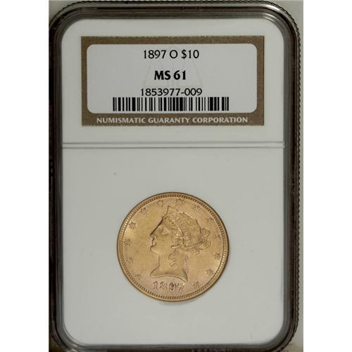 <B>1897-O $10 MS61 NGC.</B></I> Bright peach-gold surfaces display the most potent luster in the areas around, and in the interstices of, the design elements. Sharply struck, and light abrasions evenly scattered about. Census: 61 in 61, 53 finer (1/07).<BR><BR><b>Shipping:</b> Coins & Currency (<a target="_blank" href="http://www.heritageauctions.com/common/shipping.php">view shipping information</a>)