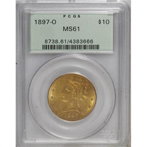 <B>1897-O $10 MS61 PCGS.</B></I> Rich green-gold toning helps conceal the small to noticeable marks that are consistent with the grade. A scant 42,500 pieces were struck, and most survivors are in AU55 to MS62 grades. Certified in a green label holder.<BR><BR><B>Coin Engraver:</B> Christian Gobrecht<BR><BR><b>Shipping:</b> Coins & Currency (<a target="_blank" href="http://www.heritageauctions.com/common/shipping.php">view shipping information</a>)