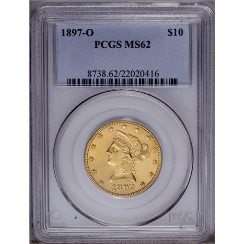 <B>1897-O<$10> MS62 PCGS.</B></I> A low mintage later New Orleans issue that infrequently appears in better Mint State grades. Satiny and uncommonly clean for the grade. The strike is typical on the lower obverse stars. Population: 29 in 62, 18 finer (2/06).