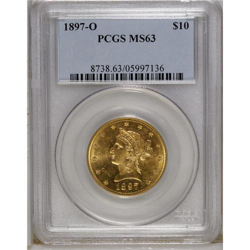 <B>1897-O $10 MS63 PCGS.</B></I> Dazzling luster and a penetrating strike affirm the quality of this pleasing better date eagle. Cleaner than is customary for the MS63 grade. New Orleans Motto eagles from this era are available in Mint State, but seldom at the Select level. Population: 18 in 63, 4 finer (10/06).<BR><BR><b>Shipping:</b> Coin/Currency (<a target="_blank" href="http://www.heritageauctions.com/common/shipping.php">view shipping information</a>)