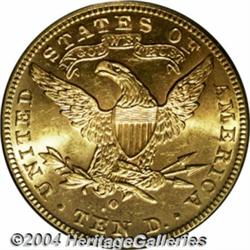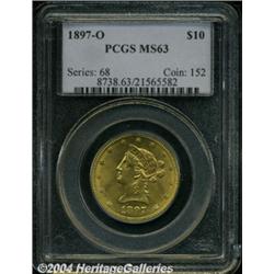 <B>1897-O<$10> MS63 PCGS.</B></I> A lustrous example of a fairly scarce date with a modest mintage of only 42,500 pieces. Well struck save for the obverse peripheral stars, with luscious medium golden-orange color. We are unsure of the conservative MS63 rating other than possible a thin pinscratch at 5 o'clock from the reverse rim to the lower arrowhead. An important coin for O-mint type purposes. Population: 11 in 63, 4 finer (3/04). <BR><BR><B>Important notice:</B> Heritage usually auctions material at the rate of 200-250 lots per hour. On some occasions eBay Live bid software or the Internet may not be able to keep up with the pace of the auction. We recommend placing a realistic absentee bid now as insurance to avoid disappointment. Occasionally the auctioneer may eliminate or reject an eBay Live bid, and the auctioneer may also reopen a lot after the close of the eBay live bidding (usually because we missed an audience bid), and may reject your bid even if it shows you as the winning bidder. By bidding via eBay Live, you agree that Heritage may award the lot to another bidder at its sole discretion under the circumstances described above or any other reasonable circumstances. Since eBay bids are not shown to us until we open the lot on the floor, we treat those bids just like floor bids. In most cases the floor responds before the eBay bid is presented to us, due to Internet lag time, so for consistency we have made it a policy that floor bids are always considered first over tie eBay live bids. Also please note that all Heritage lots purchased through eBay Live carry a 20% Buyer's Premium. Please make sure you read the Terms and Conditions before you bid. </span></font></tr></table></td></tr></table>
