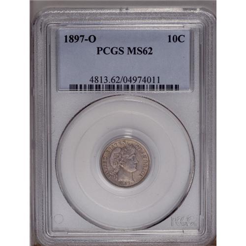 <B>1897-O 10C MS62 PCGS.</B></I> Sharply struck with moderate lilac and gold toning on the obverse, and brilliant silver color on the reverse. A scarce, low-mintage issue that is usually encountered in the lower circulated grades.
