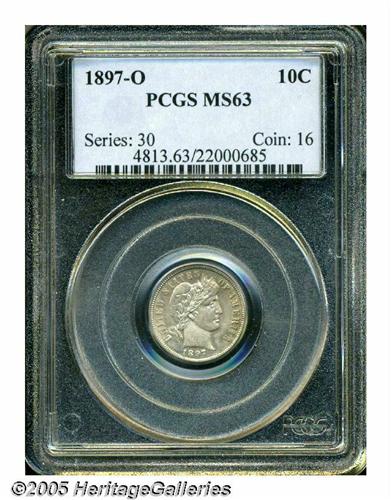 <B>1897-O<10C> MS63 PCGS.</B></I> This issue began life with a mint production of only 666,000 pieces. Virtually all 1897-O dimes entered circulation, where they were either lost or reduced to well worn states of preservation. As expected, Mint State examples are scarce. This MS63 specimen exhibits soft luster on light silver-gray surfaces, and well struck design elements. A couple of small marks are noted on Liberty's cheek. Population: 16 in 63, 31 finer (6/05).