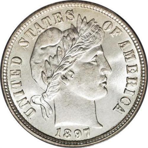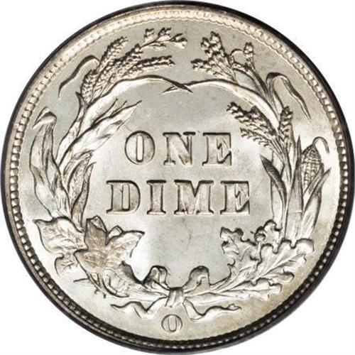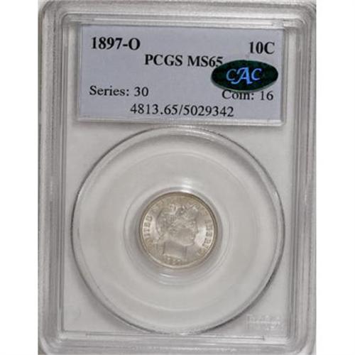 <B>1897-O 10C MS65 PCGS. CAC.</B></I> The 1897-O is the last of the four O-mint early-series issues with mintages well under 1 million coins. Only a bit more than a dozen pieces are certified MS65 at both services, with another dozen or so finer. This example displays brilliant silver surfaces tinged with gold on the reverse, which is slightly rotated counterclockwise with respect to the obverse. A nice, distraction-free Gem of this popular date. Population: 6 in 65, 12 finer (1/08).<BR><I>From The Southwest Collection.</B></I><BR><BR><B>Coin Engraver:</B> Charles E. Barber<BR><BR><b>Shipping:</b> Coins & Currency (<a target="_blank" href="http://www.heritageauctions.com/common/shipping.php">view shipping information</a>)