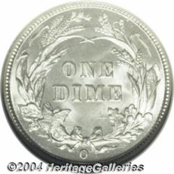 <table><tr><td><table><tr><td>1897-O 10C MS66 NGC. While not quite as scarce as the 1896-O, the '97-O is, nevertheless, a very scarce issue in the Barber dime series with an original mintage of only 666,000 pieces. This is a brilliant coin throughout, and the mint luster has a thick, satiny texture, as one would expect. There are no obvious or distracting abrasions on either side of this high grade example, making this a rare opportunity for the specialist. Population: 3 in 66, 0 finer (3/04). <BR><BR><B>Important notice:</B> Heritage usually auctions material at the rate of 200-250 lots per hour. On some occasions eBay Live bid software or the Internet may not be able to keep up with the pace of the auction. We recommend placing a realistic absentee bid now as insurance to avoid disappointment. Occasionally the auctioneer may eliminate or reject an eBay Live bid, and the auctioneer may also reopen a lot after the close of the eBay live bidding (usually because we missed an audience bid), and may reject your bid even if it shows you as the winning bidder. By bidding via eBay Live, you agree that Heritage may award the lot to another bidder at its sole discretion under the circumstances described above or any other reasonable circumstances. Since eBay bids are not shown to us until we open the lot on the floor, we treat those bids just like floor bids. In most cases the floor responds before the eBay bid is presented to us, due to Internet lag time, so for consistency we have made it a policy that floor bids are always considered first over tie eBay live bids. Also please note that all Heritage lots purchased through eBay Live carry a 20% Buyer's Premium. Please make sure you read the Terms and Conditions before you bid. <BR><BR><B>IMPORTANT ANNOUNCEMENT ABOUT RESERVES:</B> Heritage now divulges all reserves on its web site 7 days before every auction. If you want to know whether the reserve on this lot has been met, and if not, what the reserve amount is, please visit this lot page on the HeritageCoin.com web site, or email: bid@HeritageGalleries.com </span></font></td></tr></table></td></tr></table>