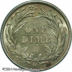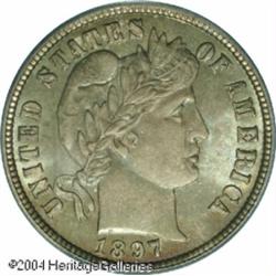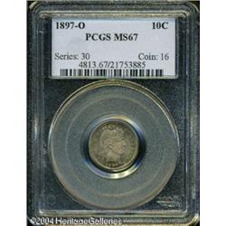 1897-O 10C MS67 PCGS. Lush apricot-gold and lime-g <B>1897-O 10C MS67 PCGS.</B></I> Lush apricot-gold and lime-green colors adorn this lustrous, exquisitely struck, and essentially pristine Superb Gem. The mintage of the 1897-O Dime is a mere 666,000 pieces, which is among the lowest productions of the type. Not surprisingly, the date resides high on the want lists of Barber specialists. Among the few dozen pieces certified in Mint State by PCGS, the majority are in MS62 to MS64 grades. Gems are rare, and Superb Gems are virtually unheard of. Population: 4 in 67, none finer (11/04). <BR><BR><B>Important notice:</B> Heritage usually auctions material at the rate of 200-250 lots per hour. On some occasions eBay Live bid software or the Internet may not be able to keep up with the pace of the auction. We recommend placing a realistic absentee bid now as insurance to avoid disappointment. Occasionally the auctioneer may eliminate or reject an eBay Live bid, and the auctioneer may also reopen a lot after the close of the eBay live bidding (usually because we missed an audience bid), and may reject your bid even if it shows you as the winning bidder. By bidding via eBay Live, you agree that Heritage may award the lot to another bidder at its sole discretion under the circumstances described above or any other reasonable circumstances. Since eBay bids are not shown to us until we open the lot on the floor, we treat those bids just like floor bids. In most cases the floor responds before the eBay bid is presented to us, due to Internet lag time, so for consistency we have made it a policy that floor bids are always considered first over tie eBay live bids. Also please note that all Heritage lots purchased through eBay Live carry a 20% Buyer's Premium. Please make sure you read the Terms and Conditions before you bid. This lot is being auctioned in conjunction with a live floor auction by Heritage Galleries & Auctioneers. All final auction and invoice information will be supplied by Heritage Galleries & Auctioneers, and all other information should be considered preliminary. Lot:5765