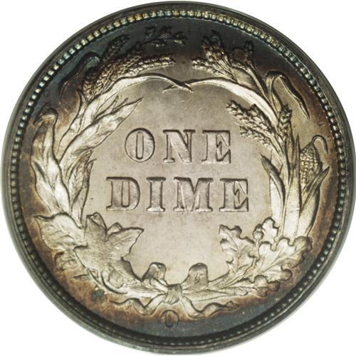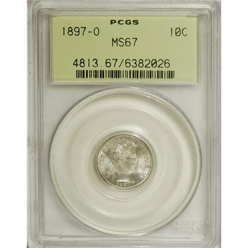 <B>1897-O 10C MS67 PCGS.</B></I> The obverse of this Superb Gem is essentially brilliant with a few small splashes of deeper color. The center of the reverse is mostly white with peripheral steel blue and golden-brown toning. From a mintage of just 666,000 coins, the 1897-O Barber dime is a scarce date in the series that is seldom found in high grade, as nearly all examples entered circulation. This piece, for example, is tied for the finest that PCGS has certified in 20 years of coin grading. Both sides have immaculate surfaces with frosty mint luster. Population: 4 in 67, 0 finer (2/07).<BR><BR><b>Shipping:</b> Coins & Currency (<a target="_blank" href="http://www.heritageauctions.com/common/shipping.php">view shipping information</a>)